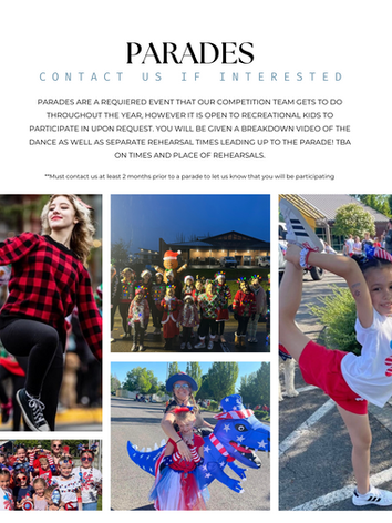 Have the chance to be apart of the excitement as we perform in community parades! This is a fantastic opportunity to showcase your talent, connect with fellow dancers, and bring joy to the crowd. Whether you're a seasoned performer or just starting out, welcome dancers of all levels to join us in celebrating our community through the art of dance. Don't miss out on the chance shine and make unforgettable memories!